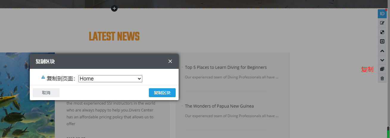 7.复制:区块支持复制,点击复制后可选择需要被复制的页面;