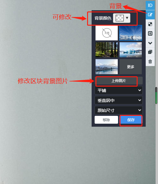 3.背景:给区块添加(修改)背景,包括背景颜色,背景图片;