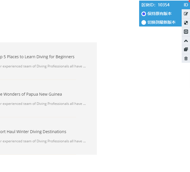 1.区块ID:每个区块都有自己的ID,在添加区块的时候可以直接搜索区块ID进行添加,如ID旁边有个小红点,代表着区块有更新,此时您需要更新区块,请勾选“切换到最新版本”来更新该区块,请记得更新区块后发布网站哦!