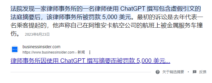 比如,前阵子轰动的美国律师在诉讼案件中完全新人chatGPT收集的案例信息,直接用于案件中,结果被发现均是虚构案件,chatGPT认为的真实存在案件,事实是虚构的。这就是为什么审查人工智能生成的内容至关重要。